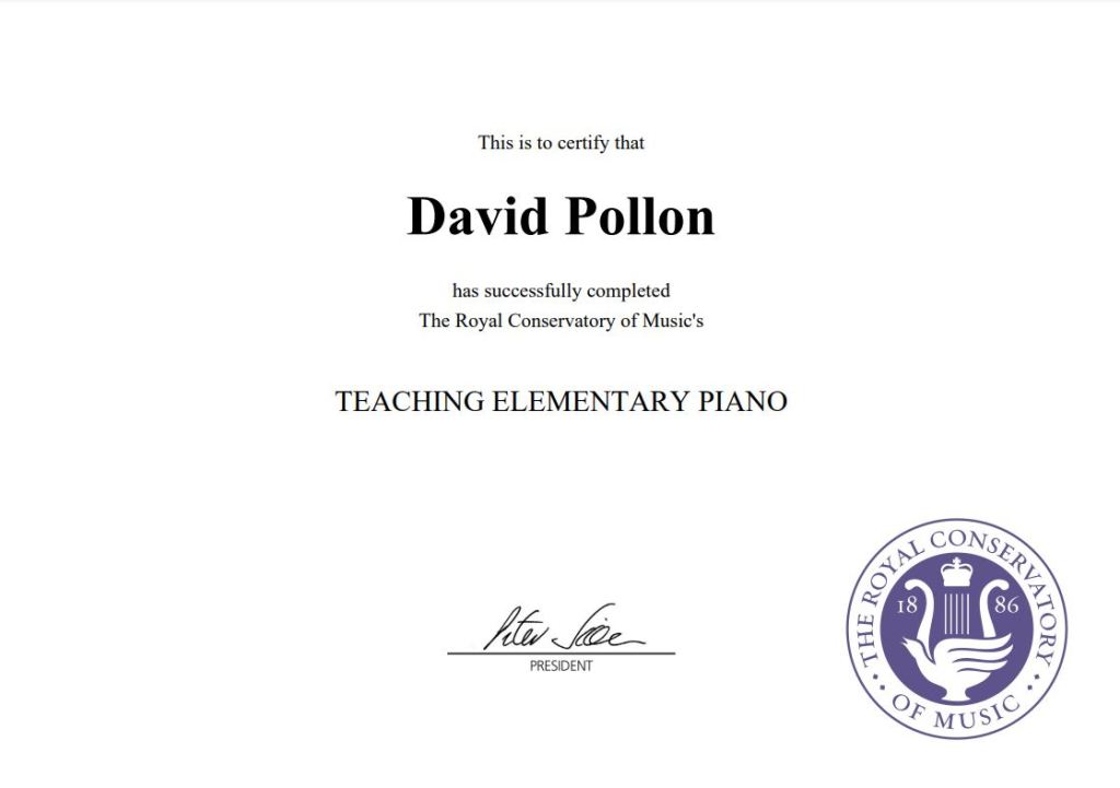 Continuing education is also very important to me. I’ve taken classes to obtain certifications for Elementary (Prep A – Level 4) and Intermediate (Level 5 – Level 8) teaching with The Royal Conservatory (RCM). Continual learning whether through your own practice/study or guided by a teacher is important for musicians so I try to set a great example for my own students.